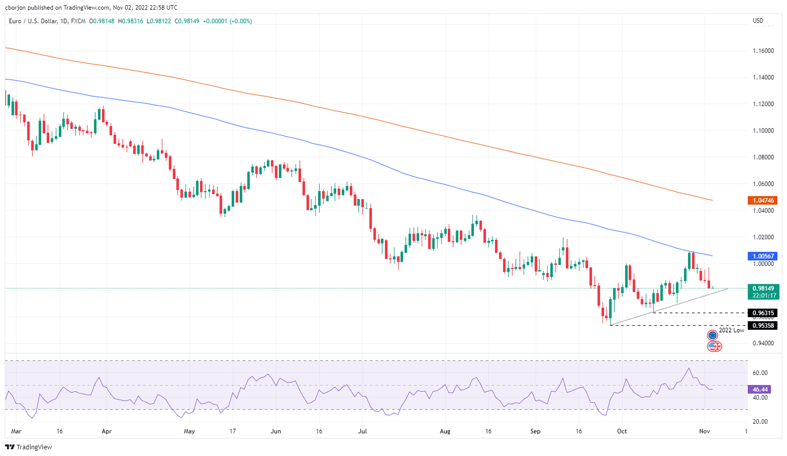 The Euro tumbled against a buoyant US Dollar on Wednesday, following the release of a dovish perceived US Federal Reserve (Fed) 75 bps rate hike, on which the EURUSD rallied and hit a fresh weekly high at 0.9975. However, Jerome Powell, the Chairman of the Federal Reserve, turned hawkish, sending the markets into turmoil, while the safe-haven USD pared its earlier losses. At the time of writing, the EURUSD is trading at 0.9814, at fresh weekly lows, as the Asian session begins.