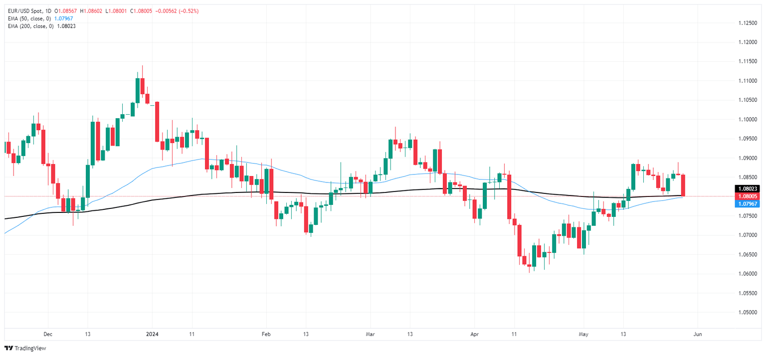 EUR/USD has drifted back into the 200-day Exponential Moving Average (EMA) at 1.0802, falling sharply lower after failing to recapture the 1.0900 handle. The pair remains down in 2024, falling -2.15% from the year’s opening bids near 1.1035.