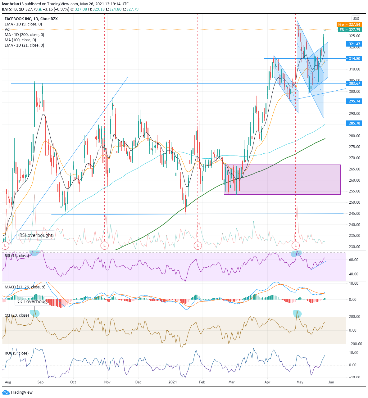 FB shares gapped up initially after a strong earnings release on April 28. Earnings per share reported at $3.30 versus a consensus estimate for $2.35, a 40% beat. Facebook shares rallied 7% post the release and created a nice gap on the chart. As often happens, the gap needed to be filled, and FB shares duly obliged, retracing the entire gain by May 10. The Relative Strength Index (RSI) and the Commodity Channel Index (CCI) both signalled the sell-off with both momentum oscillators entering overbought territory, highlighted. Facebook did find support just around the $300 level and has formed a tentative bullish channel formation. The key is to remain above the 9-day moving average at $318. A break of this would likely see a retracement to support at $303.67 and trend line support at $306, as well as the lower trend line at $299. Once again it is showing a strong support zone around $300. There is nothing too strong or high conviction around current levels. The RSI and CCI are trending with price and in neutral zones, the Moving Average Convergence Divergence (MACD) did give a crossover buy signal on Monday, but nothing else confirmed this. Indicators are far from perfect, so if one gives a signal it is always preferable to have confirmation from another indicator.