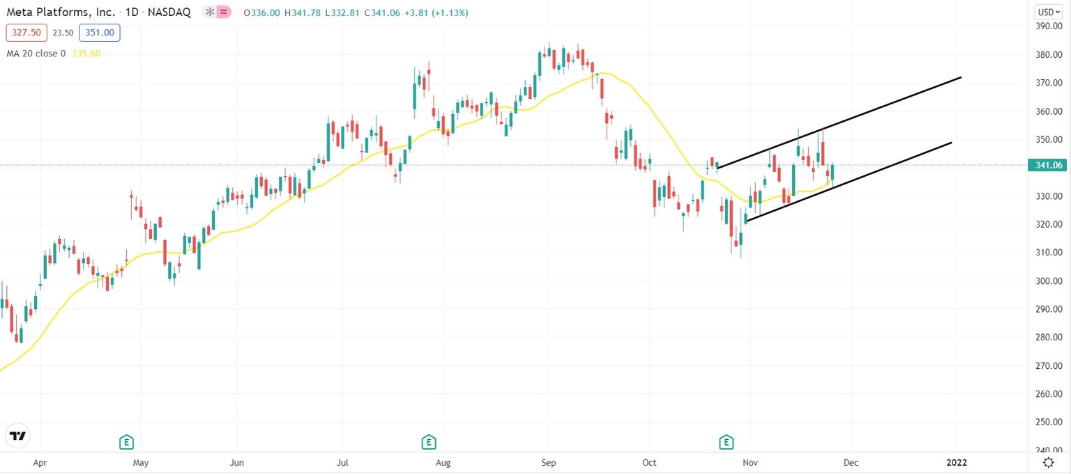 Since earnings on October 25, FB stock bottomed out around $310 before bulls jumped in to buy up undervalued shares. Since then FB stock has created a sort of ascending price channel starting on October 29. A double top on November 15 and 22 surrounding $353.75 may have scared off some bulls, but FB shares once again found their footing at $333, well above the earlier support of $327.