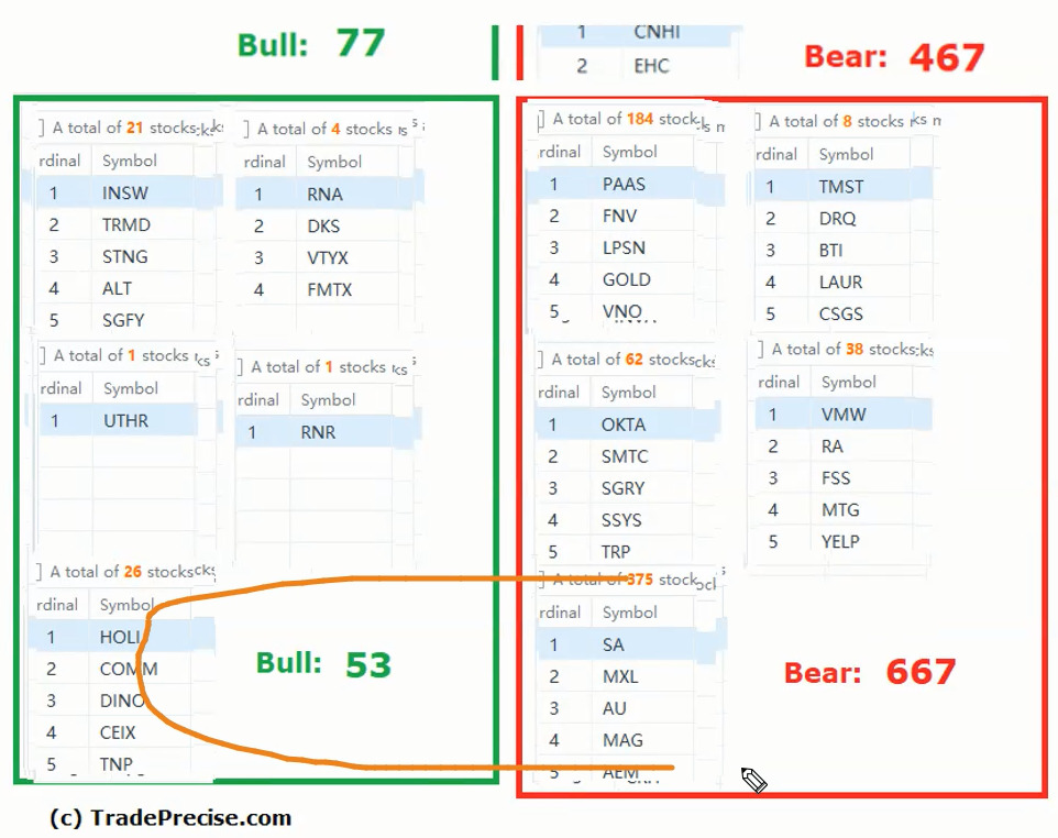 The bullish setup vs. the bearish setup is 53 to 667 from the screenshot of my stock screener below. More stock leaders were shot down with only a handful of stocks from the Biotech and Solar industry groups being resilient and bucking the trend.