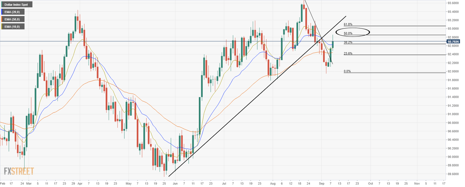 The greenback is bid mid-week, with the DXY eyeing the counter trendline and the 61.8 % golden ratio as follows: