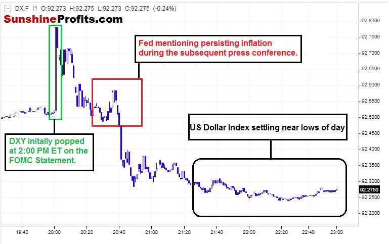 However, there was some notable price action in the US Dollar Index during Wednesday’s session. The US Dollar Index initially rose on the FOMC statement at 2:00 PM. During the press conference, the USD fell as Fed Chair Jerome Powell mentioned that inflation should persist for several months. It is noteworthy price action and can be a forward-looking indicator for the direction of other asset prices.