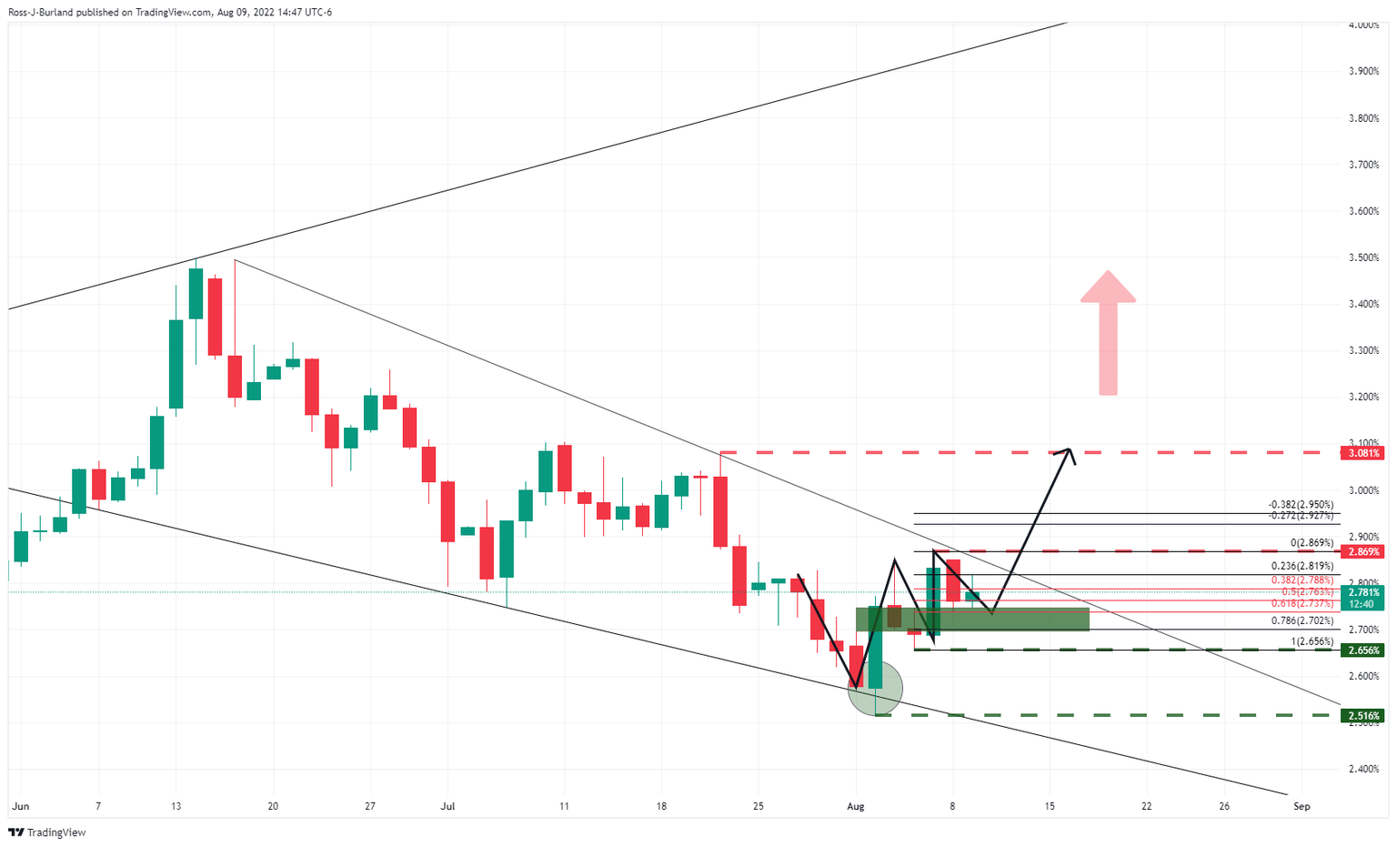 In turn, should the price hold above the flagged levels on the chart above, then a break of the trendline resistance could result in a rally in yields