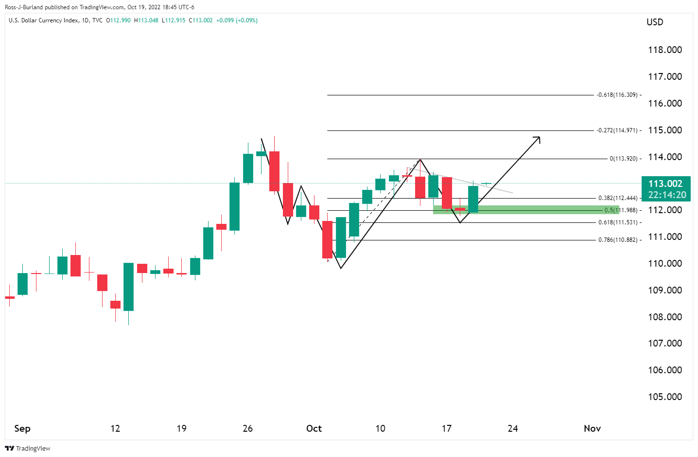 As for the US dollar, it rallied from two-week lows mid-week with a rise in US Treasury yields that made 14-year highs as investors maintained expectations that the Federal Reserve will continue to aggressively raise rates and is now breaking structure on the DXY daily chart as follows: