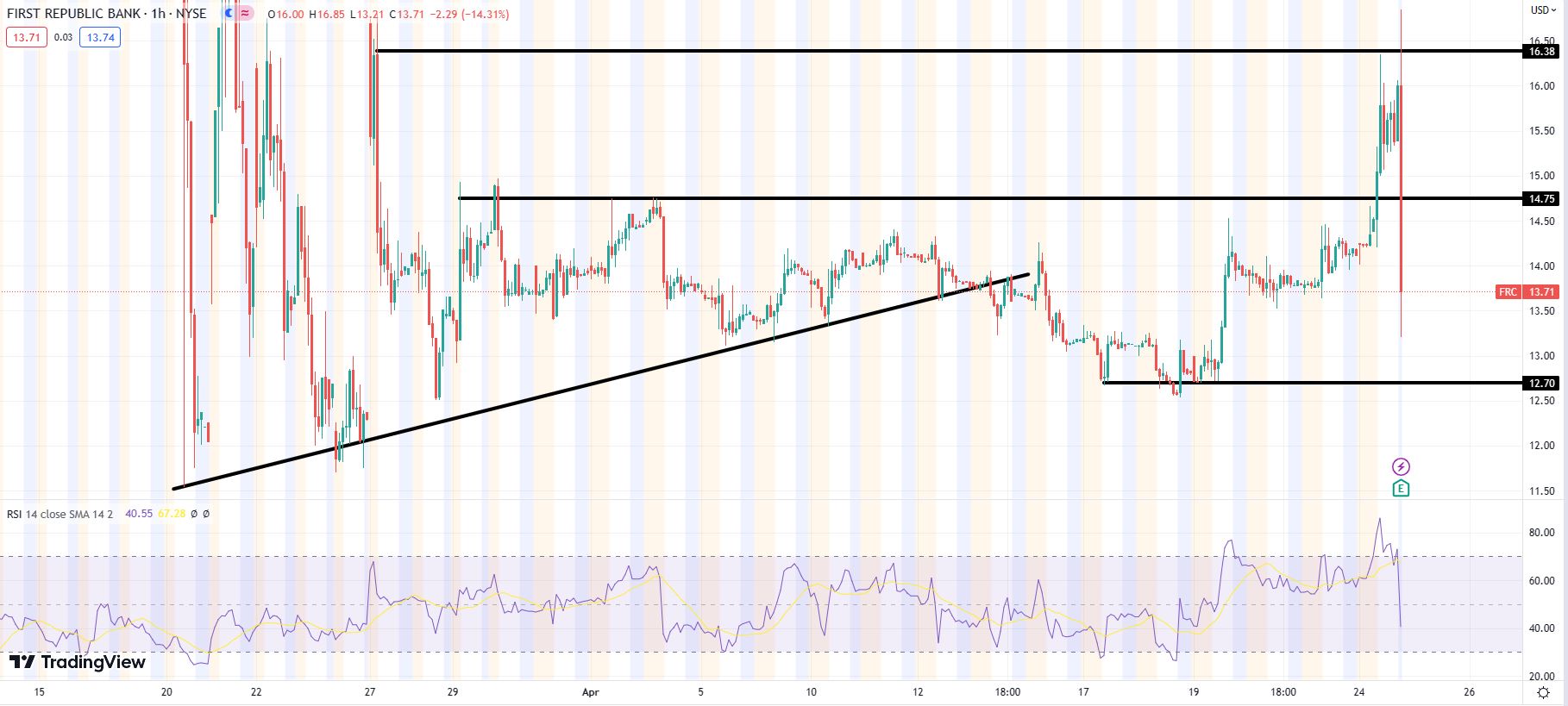 The 1-hour chart below shows FRC stock hurtling toward support at $12.70. That is far below the $14.70 threshold that FRC bested in Monday's regular session but could not seem to hold. $12.70 helped on three occasions last week and will likely hold the line this time around as well. This brings to an end the short