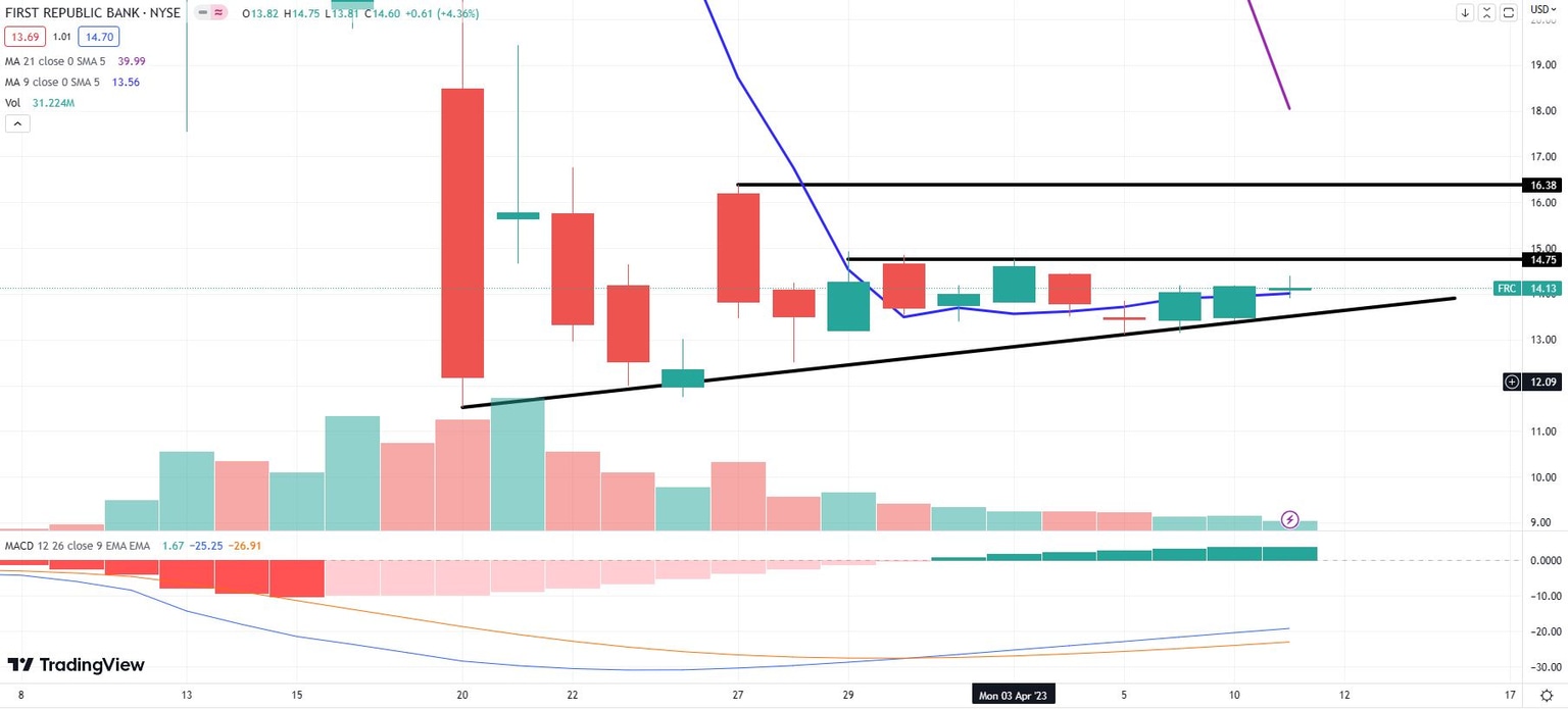 With FRC stock tanking so deeply since the beginning of the year, the daily chart below zooms in on just the past four weeks of price action. As you can see, FRC dumped hard into the $12 level in mid-March but has mostly been rebounding at a gradual pace since then. The upward sloping lower trendline is set to run smack into the $14.75 resistance level that FRC has bumped up against on March 29, March 30, and April 3. This point of resistance produces a wedge with the higher lows created on the bottom side.