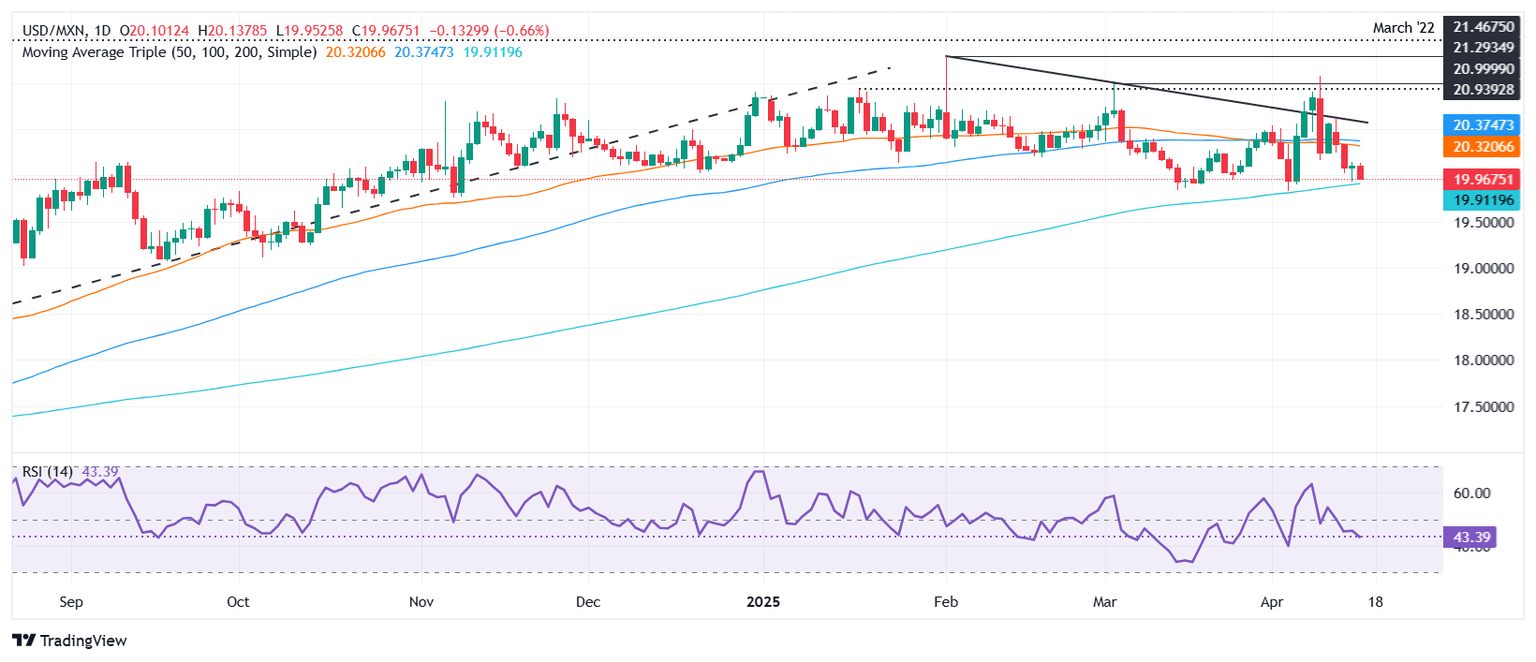 USD/MXN continues to trade lower, below the 20.00 psychological figure, with the Mexican Peso appreciating sharply. On further weakness, the exotic pair might test the 200-day Simple Moving Average (SMA) at 19.86, followed by the 19.50 figure. Otherwise, buyers could drive the pair towards the 20.00 psychological figure.