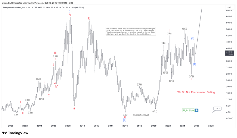The invalidation level for this bullish structure stands at $3.52, the 2016 low where wave (II) ended. As long as FCX remains above that level, the right side of the market stays bullish. Additionally, rising global demand for copper, driven by electrification and renewable energy, supports the long-term outlook.