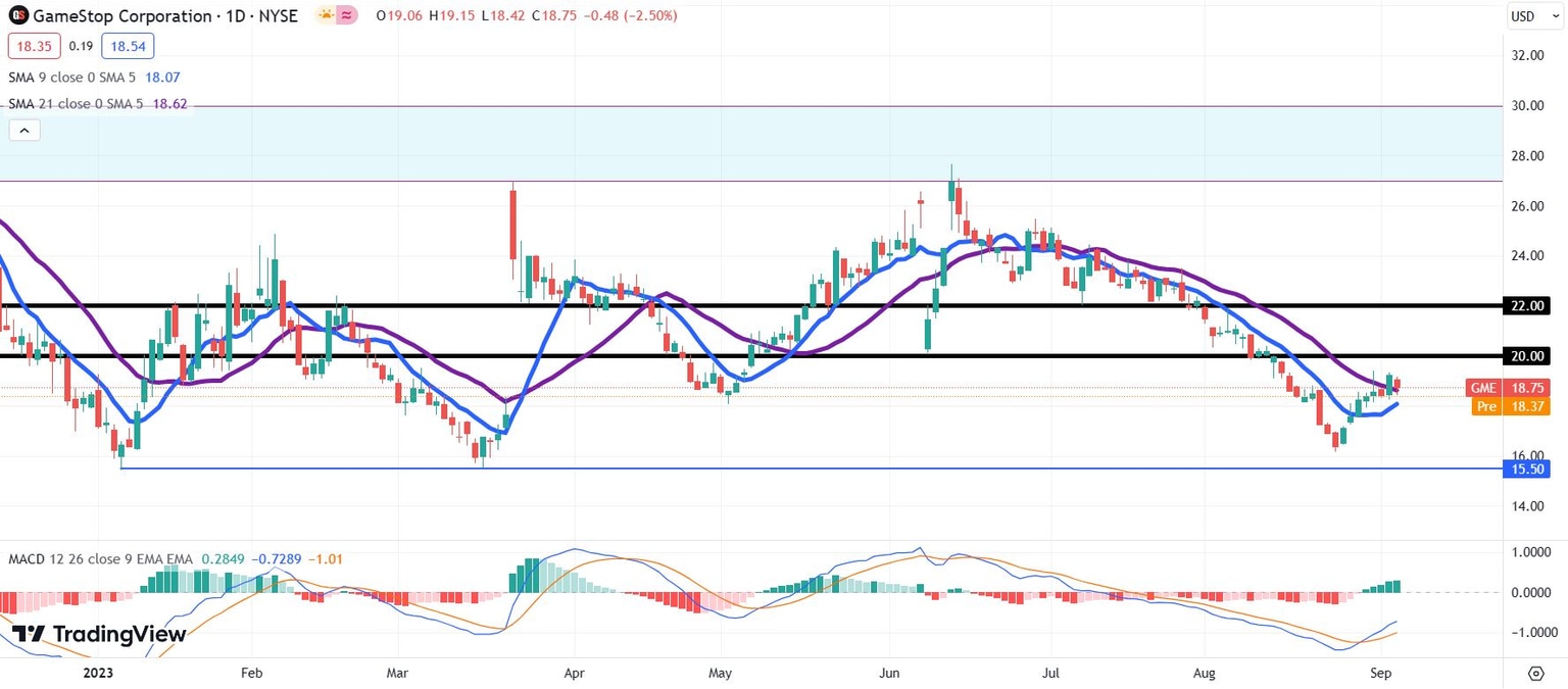GameStop stock was already trending upward in the lead up to Wednesday earnings announcement. The Moving Average Convergence Divergence (MACD) indicator has crossed over in bullish fashion, and the 9-day Simple Moving Average (SMA) is narrowing its gap with the 21-day SMA. GME has been recovering from a downtrend that began in mid-June and only began to reverse in late August.