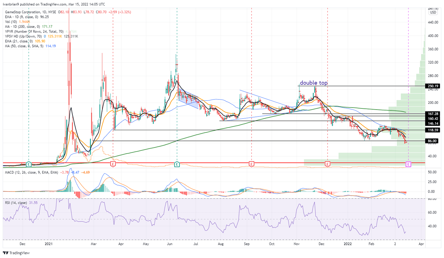 GME stock closed below our key support at $86 on Monday. This will likely lead to more selling pressure. That will bring GME quickly down to $70, and we may then see a stabilization period as volume is quite strong around the $70 level.