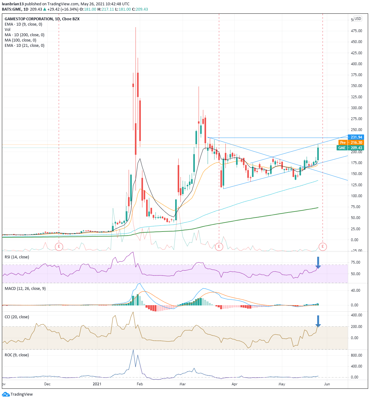 Gamestop (GME) Stock Price and Forecast: GME in sight of key $231.94 resistance with RSI overbought