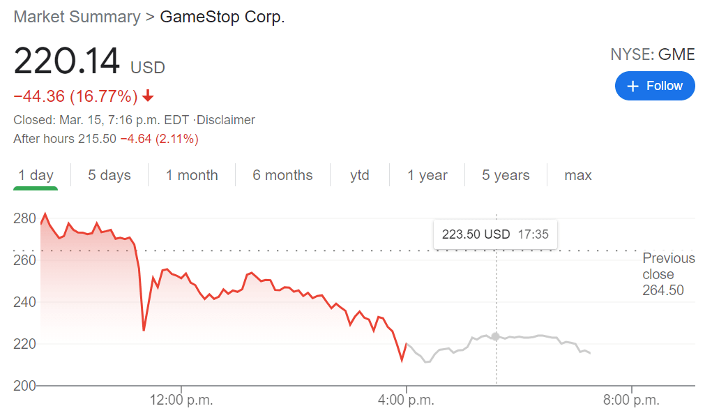 NYSE:GME investors did not have the start to the week that they were anticipating after mostly positive movement over the past three weeks. On Monday, the first trading day after the recent $1.9 trillion stimulus package began to make its way to investors, GameStop plunged by 16.77% to close the trading session at $220.14. Shares were momentarily halted at one point due to a massive spike in volatility that caused GameStop to fall by nearly 20% within a few minutes. It is definitely not the first time that GameStop has been halted due to trading volatility, but it is interesting to note that Monday’s drop came with half of its normal average trading volume.