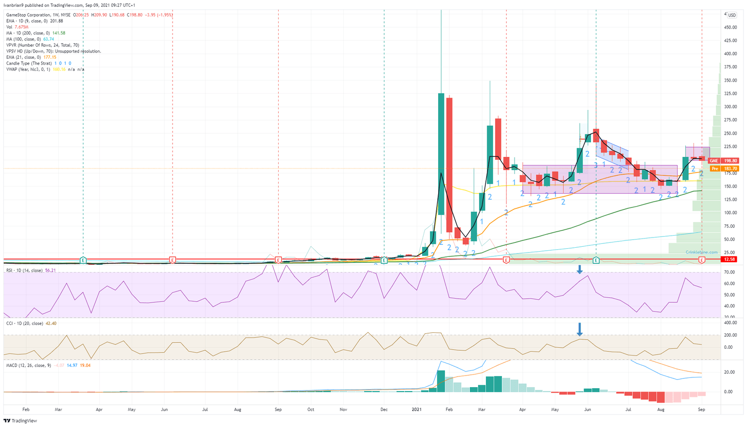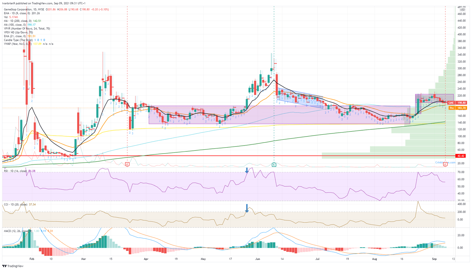 Now that GME has broken back below the flag, the bullish move is certainly over. From a technical view, we are now bearish despite entering the consolidation zone. The stock is trading below the short-term moving averages, and the Relative Strength Index (RSI) is trending lower and is about to go below 50. The next support zone we see is at $140 from the 200-day moving average and the yearly Volume Weighted Average Price (VWAP).