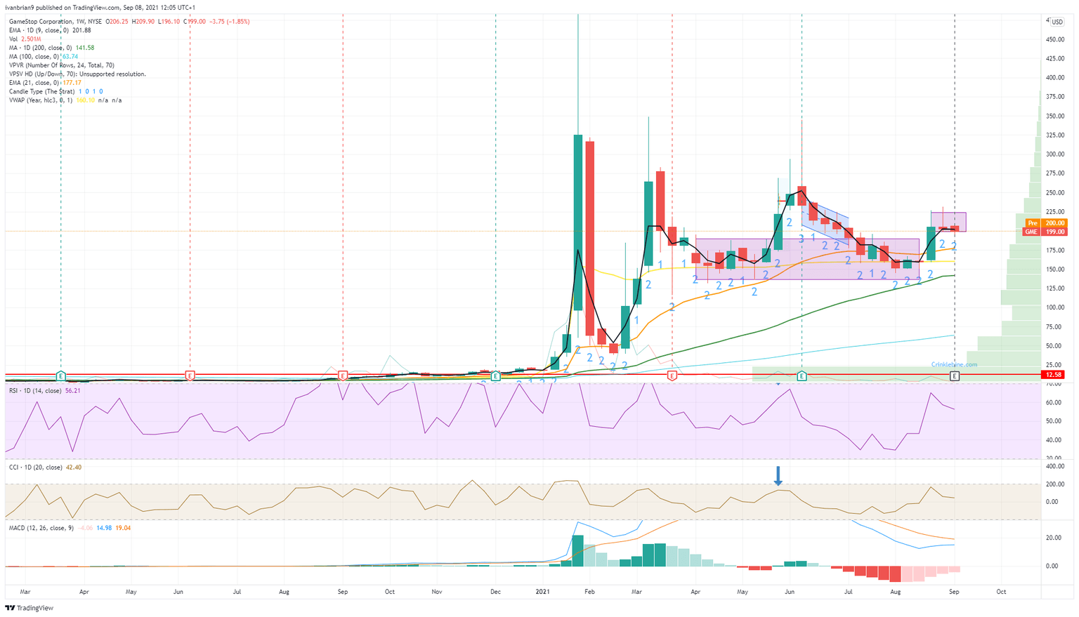 The weekly chart does show one area of concern, each massive spike is getting progressively lower. However, the consolidation phase after each spike is now looking a bit more consistent around $150 than after the first spike back in January/February when GME dropped back to under $40.