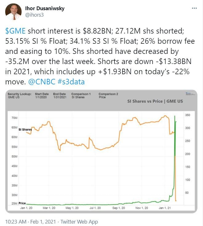 Update February 2: Shares in Gamestop (GME) collapsed again on Tuesday as the retail-fueled frenzy in heavily shorted stocks appeared to be coming to an end. Gamestop (GME) shares are down nearly 50% at the time of writing. S3 partners reported that the short interest in GME had fallen sharply and the cost of borrowing the stock had also fallen.
