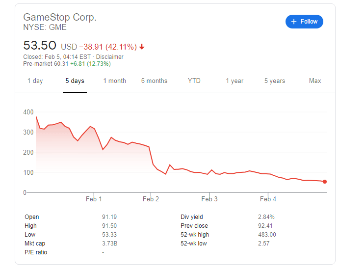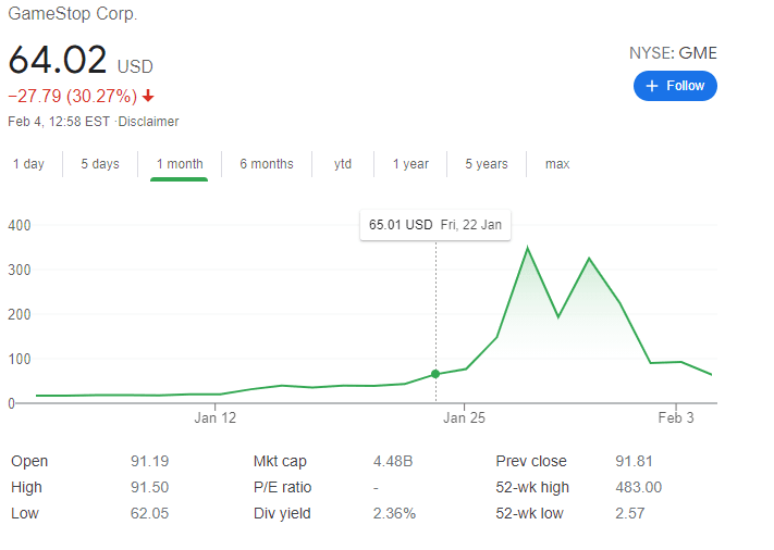 Update 2, Monday, February 8: Gamestop (GME) shares continued to move lower as Monday progressed. Shares in GME are down another 7% at $59. This despite the broader market setting yet another record high as investors pile into stocks. AMC, another Reddit meme stock also continues to struggle. AMC shares are down 12% on Monday. The game is over as retail traders, late to the prty, suffer heavy losses in Gamestop and other related stocks.