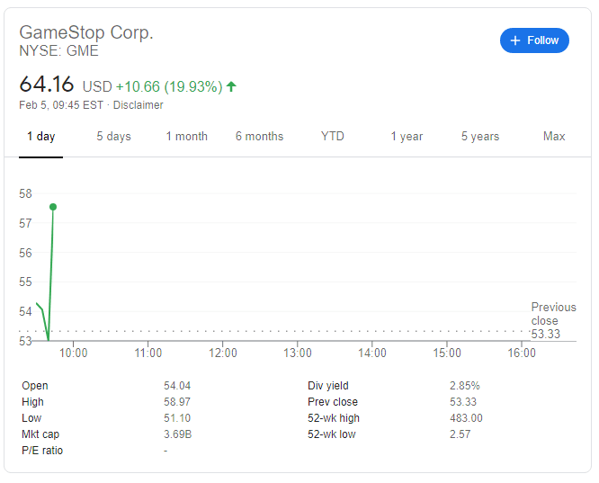 Update 2 Friday, February 5: GameStop shares continued their usual wild ride on Friday. Early in the session, GME shares topped out at $95 as news that Robinhood lifted all trading restrictions helped. GME shares surged from the open of $54 to trade as high as $95. Failure to break the psychological $100 level and renewed short interest brought GME crashing back down. GME is currently trading at $58 at the time of writing, up 9% for the day.