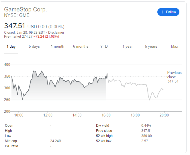 Update: GameStop Corp.(NYSE: GME) is changing hands at around $300, down by around 13% but above the lows. Buyers seem to be fighting back ahead of option expires on Friday.