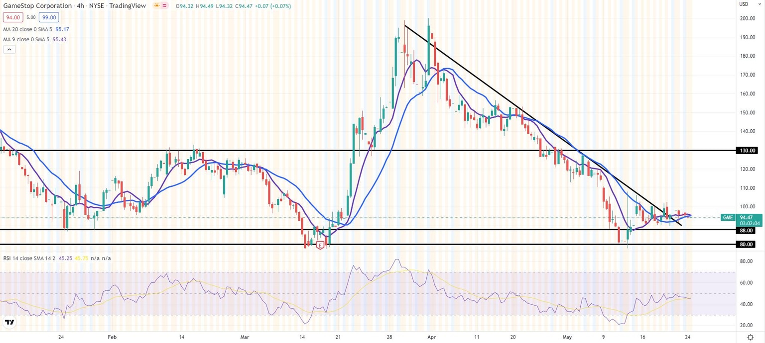 GameStop (GME) stock is reacting very little to management's unveiling on Monday of its first branded cryptocurrency wallet. In fact, shares are down 1.2% in the premarket on Tuesday to $95. This does not mean, however, that GME is destined to follow the market lower over the next few weeks. In contrast to the general market, GameStop's 4-hour chart presents a rather bullish case for a move higher, possibly to $130.