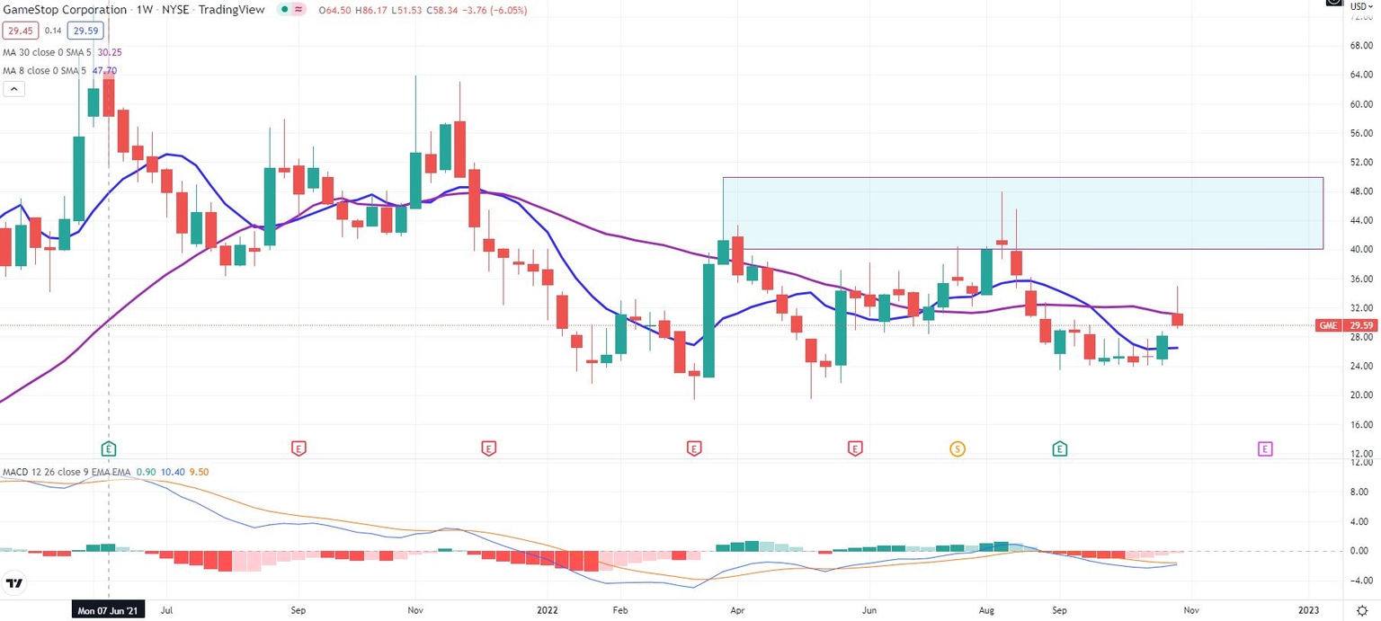 The clearly positive sign on the weekly chart below is that GME's share price briefly shot up above the 30-week moving average. Of course, now it needs to close above that level on the chart with the moving average currently at $31.10. The standard bull price target in the short term would be above $40. Weekly candles in March, July and August of this year all seem to show resistance once prices achieve the $40 level, although GME did spike to $49.85 in late March. A push above $50 could send the stock up to the next resistance point at $63.