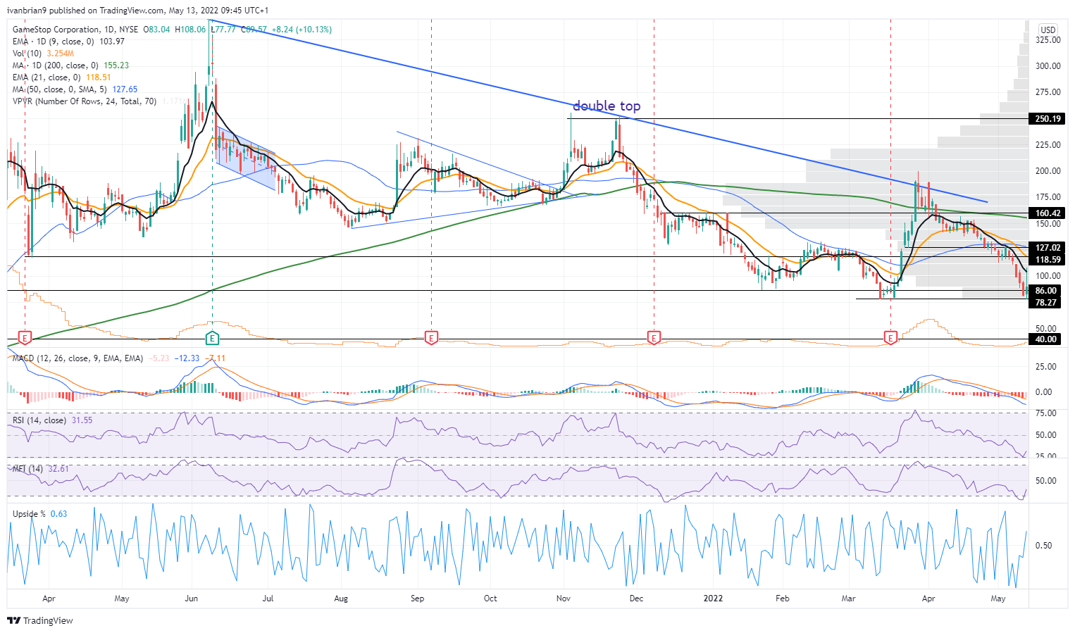 Another feature that we noticed from a lot of meme stocks on Thursday was that they put in a much higher high than the closing price. This is the complete opposite of what the main indices did. GameStop stock spiked up to $108 but closed at $89. That is a bit concerning. Momentum was not maintained. We expect the stock to rally again on Friday though as overall the main indices should recover some ground. $108 is the 9-day moving average, and above $118 is strong resistance going back to April 2021. We would not expect the rally to extend beyond here.