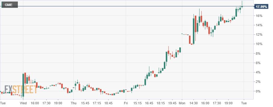 Update: GameStop trades at $218.00 per share, down roughly 12%. Wall Street spent most of the day in the red, although major indexes bounced ahead of the close. Only the Nasdaq Composite remains in the red, as the tech sector was the worst performer. As for the NYSE, it's currently up 50 points, while the DJIA is the best performer, adding 165 points or 0.47%. Market participants await US inflation and growth-related data to be out on Wednesday, rushing into safety ahead of it.