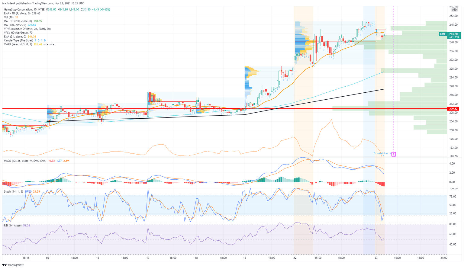 In the shorter term, the move is held by support at $234 as we can see from the 15-minute GME chart below. Once under $234, there is a large volume gap until $213, so any break could accelerate.