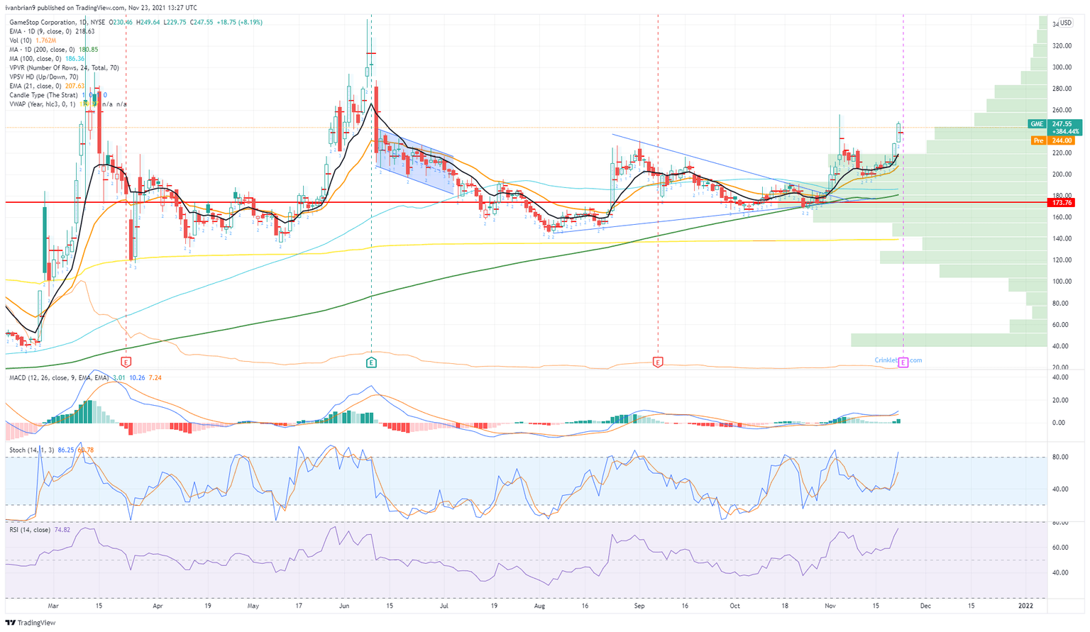 The daily chart does not really give too many clues. GME has been relatively calm of late just like its little brother AMC. The crowd moved onto the EV stocks such as Rivian (RIVN) and Canoo (GOEV) as the volatility waned, and so the opportunity there was greater. Breaking resistance at $255 may get GME going again, but we feel it will be back to $220. This one is likely to slide in the coming days. Momentum is due to tail off as Thanksgiving approaches, and GME is the king of momentum stocks.