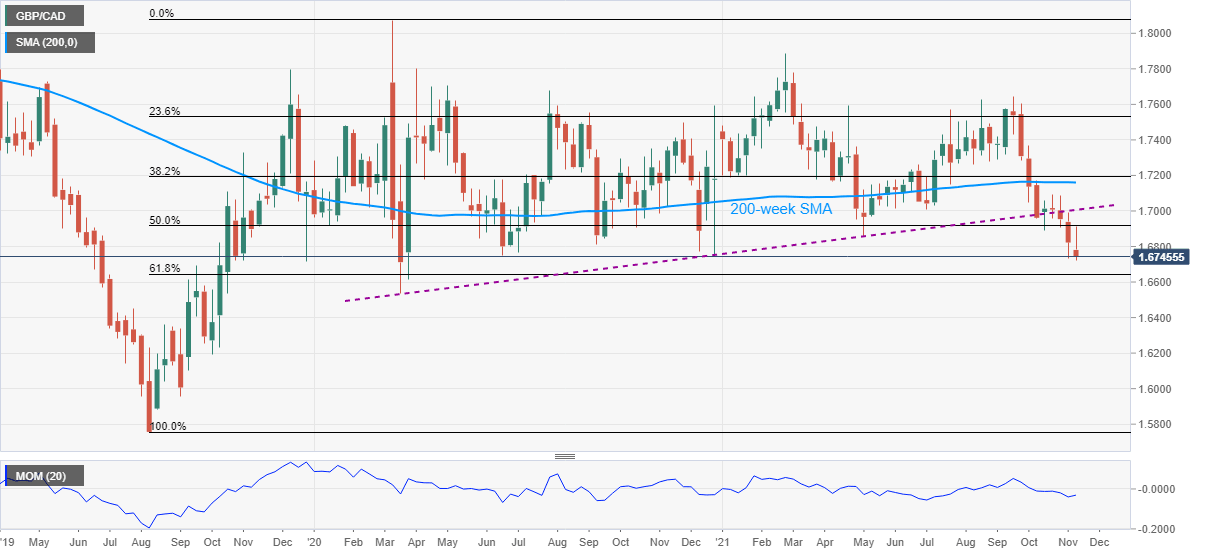 GBP/CAD defends the 1.6700 threshold during an inactive Thursday morning in Asia, seesawing around 1.6750 following the slump to the 20-month low.
