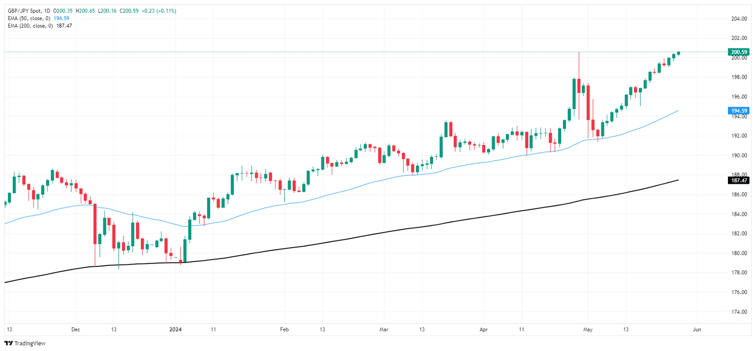 GBP/JPY is up over 12% after knocking into the 200-day Exponential Moving Average (EMA) at the beginning of 2024. The pair has closed in the green for all but three of the last 16 consecutive trading days.
