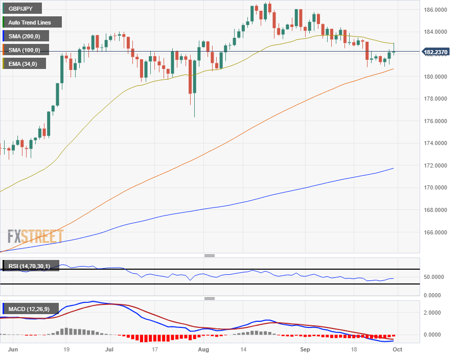 The GBP/JPY is struggling to keep itself above the 200-hour Simple Moving Average (SMA) currently marked in at the 182.00 handle, and intraday action sees the pair getting hung up on the 34-hour hour Exponential Moving Average (EMA).