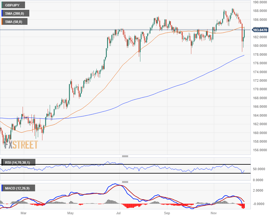 The GBP/JPY is up over 5% from last week’s plunge into 178.58, but the pair is still down 2.65% from November’s late peak of 188.66. The 50-day Simple Moving Average (SMA) is holding bids to the midrange, with long-term moves catching chart support from the 200-day SMA rising into 178.00.