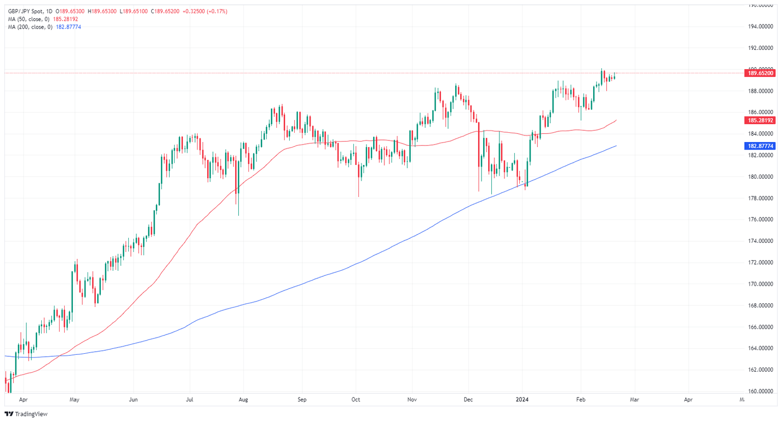 The GBP/JPY continues to test into the 190.00 major handle, and the pair sees firm technical support after rebounding from the 200-day SMA below 182.00 in early 2024. The pair remains up around 6% from December’s choppy swing low into 178.00.