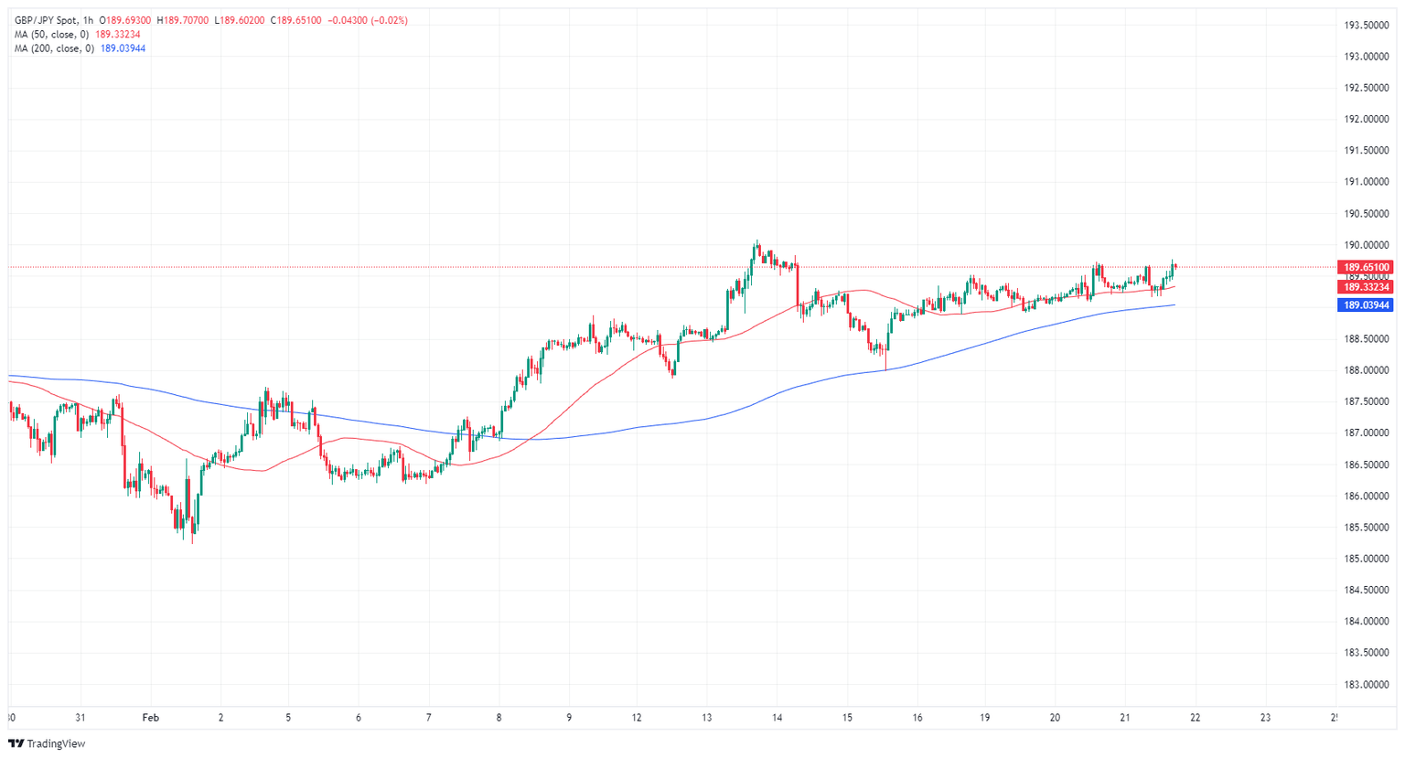 The Guppy continues to drift into the high end with the pair sticking close to its highest bids since 2015. The GBP/JPY continues to be bolstered by the 200-hour Simple Moving Average (SMA) near 189.00 in the near-term, and momentum is holding firmly in the bullish side despite slowing gains on the chart.