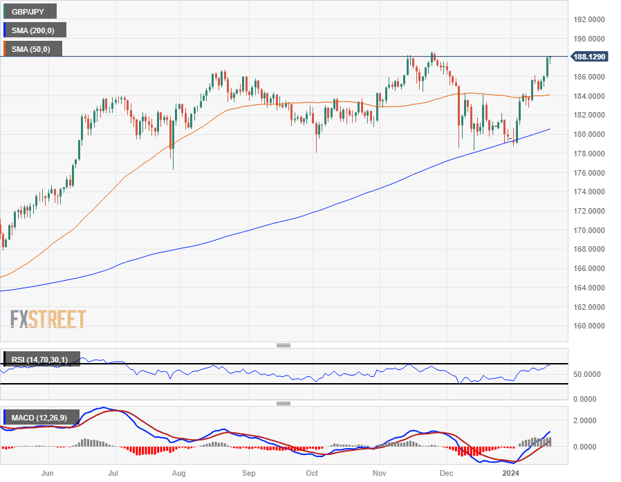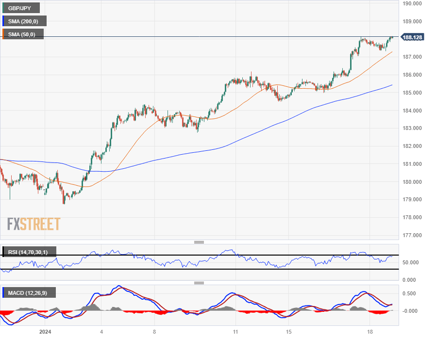GBP/JPY tipped into a fresh daily high above 188.00 on the pair’s march toward all-time highs above 189.00 with the Pound Sterling (GBP) climbing on market confidence that the Bank of England (BoE) is on pace to begin cutting interest rates by August, while the Bank of Japan (BoJ) remains planted in a firmly dovish monetary policy stance for the foreseeable future, driving the Japanese Yen (JPY) into the floorboards.