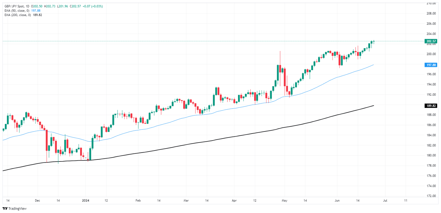 The Guppy ticked into a fresh 16-year high on Tuesday, clipping 202.73. The pair is on pace to close flat or higher for the seventh consecutive trading day, and GBP/JPY has risen over 6% from mid-May.