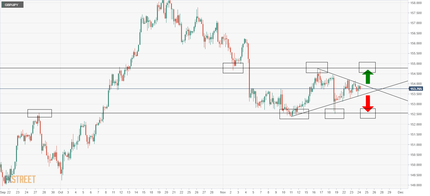 Price action over the last few days has been squeezing itself into a pennant formation. That suggests a breakout to either the upside, where a test of recent highs in the mid-154.00s is on the cards, or to the downside, where a test of recent lows around 152.500 would be likely.