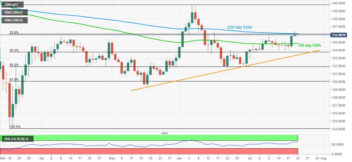 GBP/JPY recedes from 136.14 to 136.00 amid the initial trading on Tokyo’s bourses during Wednesday. The quote rose to the highest since June 11 the previous day. However, failure to provide a daily closing past-200-day EMA increases the odds of a pullback.