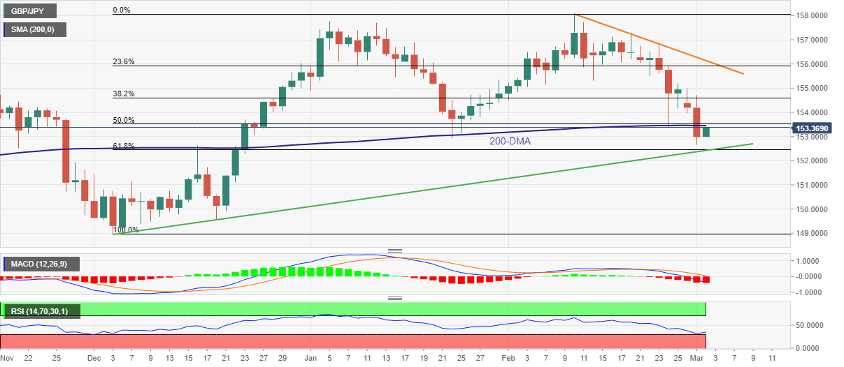 The recovery movers, however, struggles to overcome the 200-DMA level near 153.30. Also challenging the GBP/JPY buyers is the 50% Fibonacci retracement of December 2021 to February 2022 upside, near 153.35, as well as bearish MACD signals.