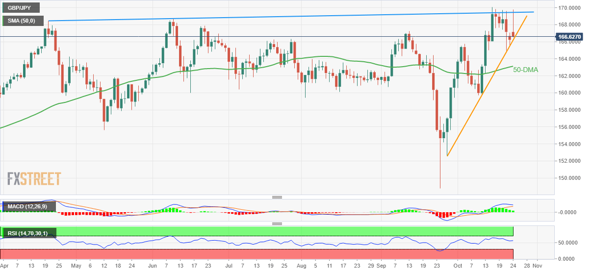 However, bullish MACD signals and the steady RSI requires the GBP/JPY bears to remain cautious unless they break the aforementioned support line, around 166.20 by the press time, as well as conquer the 166.00 thresholds.