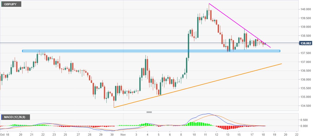 Also challenging the GBP/JPY bulls is a falling trend line from November 11, at 138.05 now, as well as bearish MACD signals.