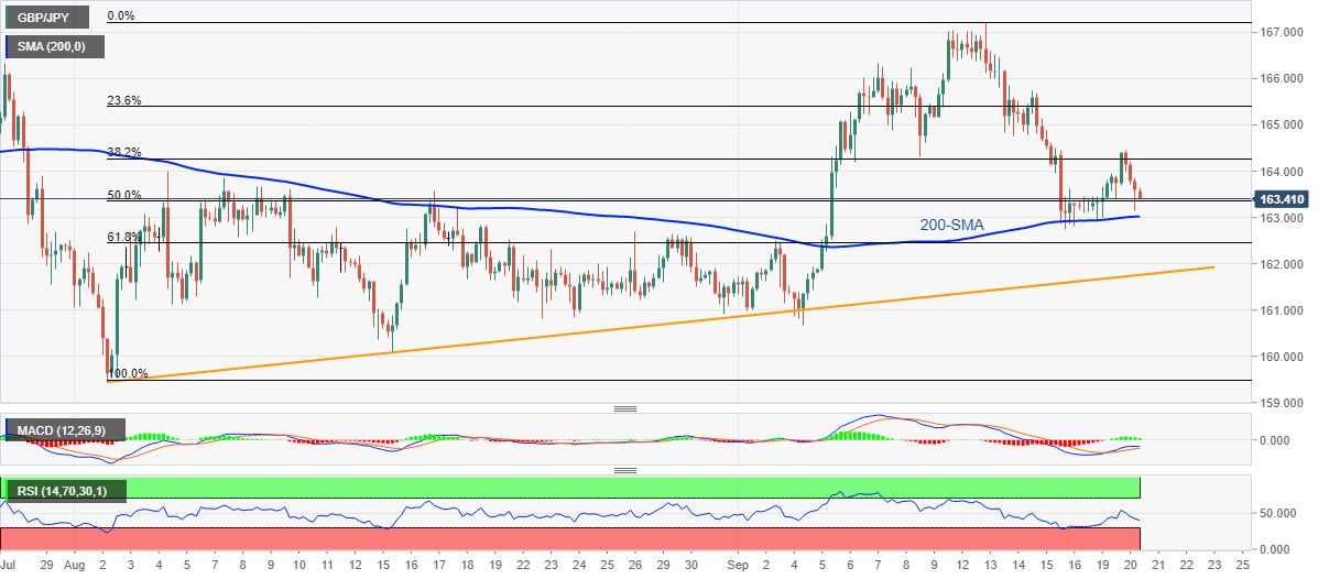 GBP/JPY remains pressured towards the 200-SMA as it extends the previous day’s losses to 163.40 during Wednesday’s Asian session. In doing so, the cross-currency pair justifies the recent pullback from the 38.2% Fibonacci retracement level of the August-September upside.