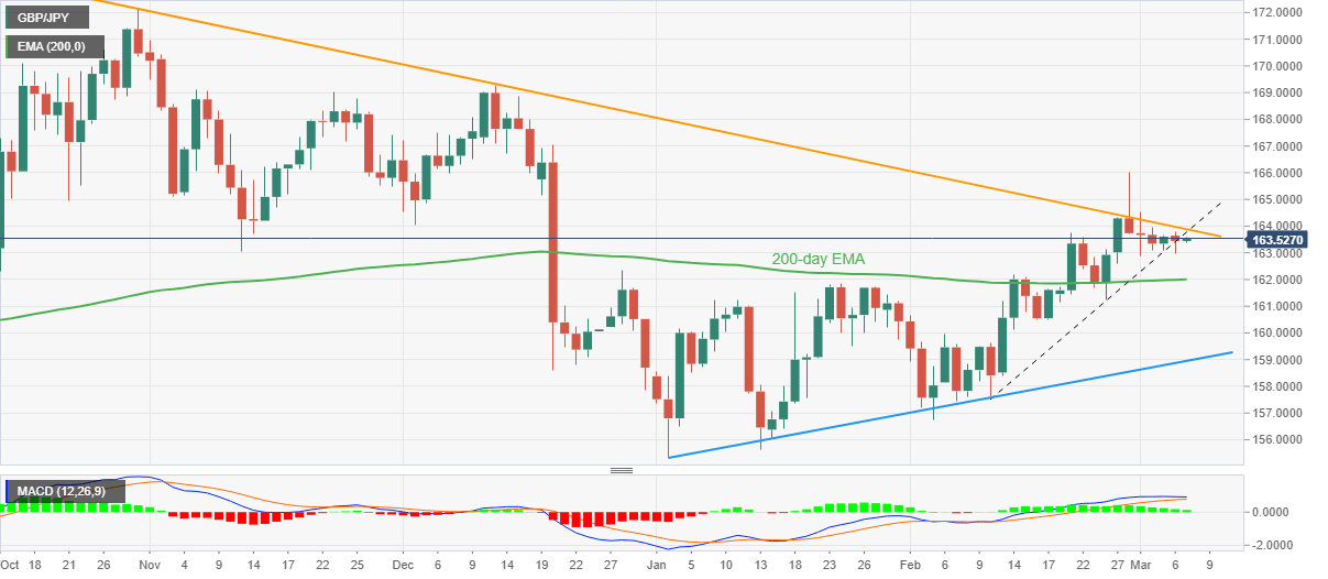 GBP/JPY treads water around 163.50 during early Tuesday, following a daily closing beneath the one-month-old support line, now resistance, the previous day. Not only the trend line breakdown but the receding bullish bias of the MACD also keeps the cross-currency pair’s sellers hopeful.