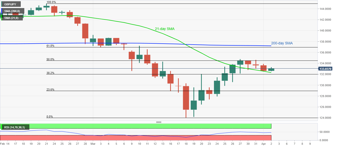 Following its drop to the weekly low, GBP/JPY bounces off 21-day SMA, currently around 132.90, amid the Asian session on Thursday. Even so, the pair remains below 50% Fibonacci retracement of its February-March downside.