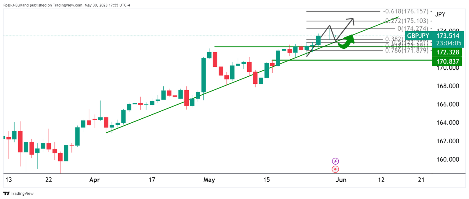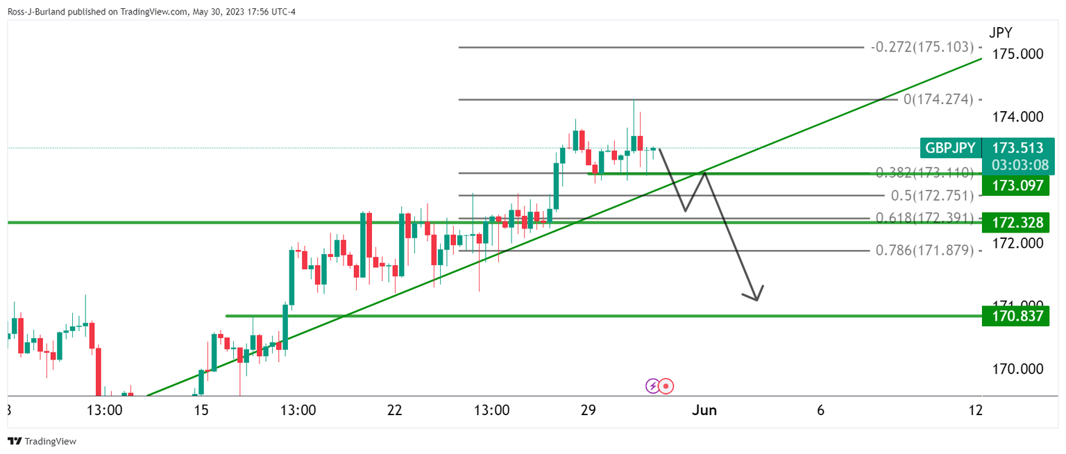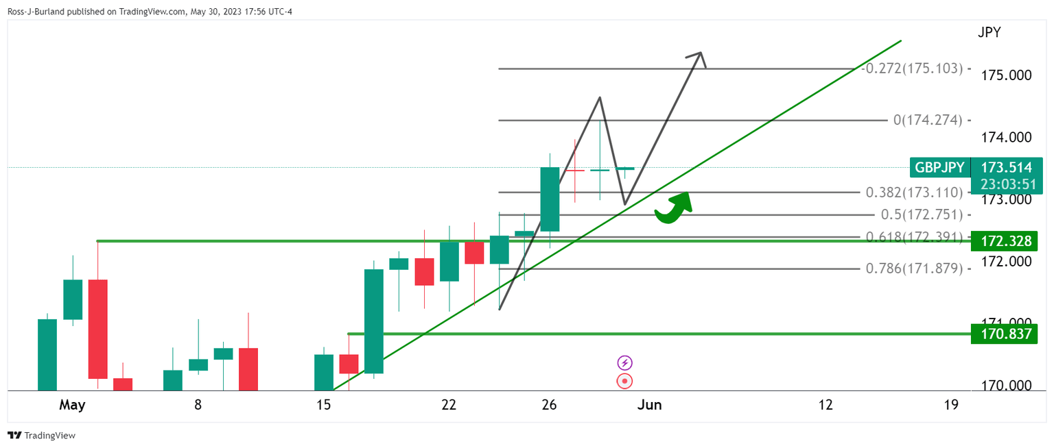 GBP/JPY is testing fresh bull cycle highs near 174.00 but this may be the highs. We are completing the initial balance for the week and there is length in the market that could attract the bears. The following will illustrate both sides of the story.