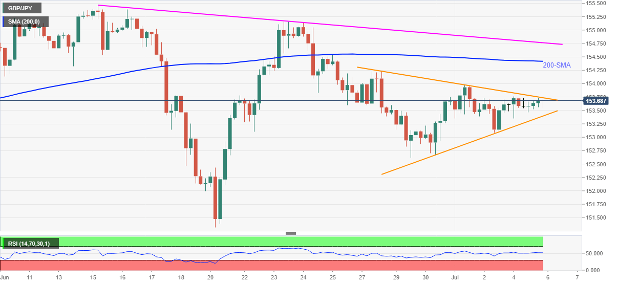 GBP/JPY gains upside momentum, mildly bid around 153.70, amid the initial Asia session on Tuesday. In doing so, the cross-currency pair funnels down the bullish break of a short-term symmetrical triangle amid a slightly upbeat RSI line.