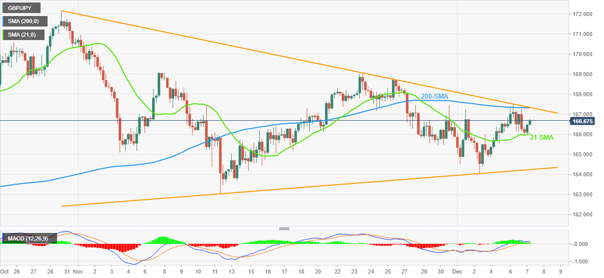 However, a convergence of the 200-SMA and downward-sloping resistance line from the October-end, near 167.30, appears a tough nut to crack for the pair buyers.