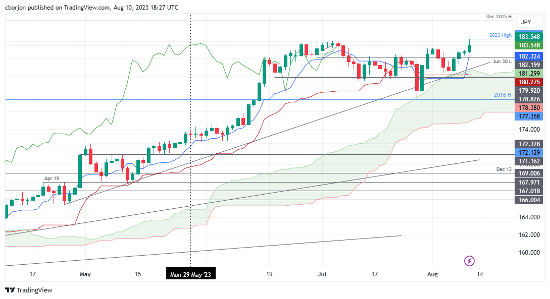 The GBP/JPY resumed its uptrend, despite dipping towards the 183.40s area as of writing, sponsored by several factors. The Ichimoku Cloud (Kumo) remains below the price action, while the crossover of the Tenkan-Sen above the Kijun-Sen, opened the door for further upside, as seen during Thursday’s session.