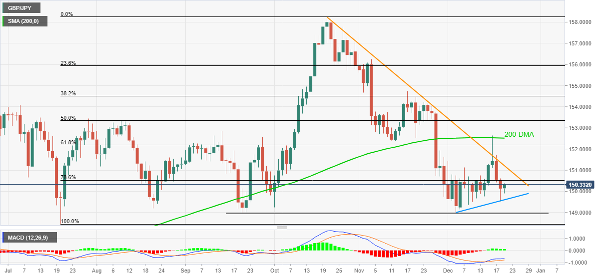 The cross-currency pair keeps the bounce off a two-week-long ascending support line amid bullish MACD signals to direct GBP/JPY towards 78.6% Fibonacci retracement level of July-October upside, near 150.50.